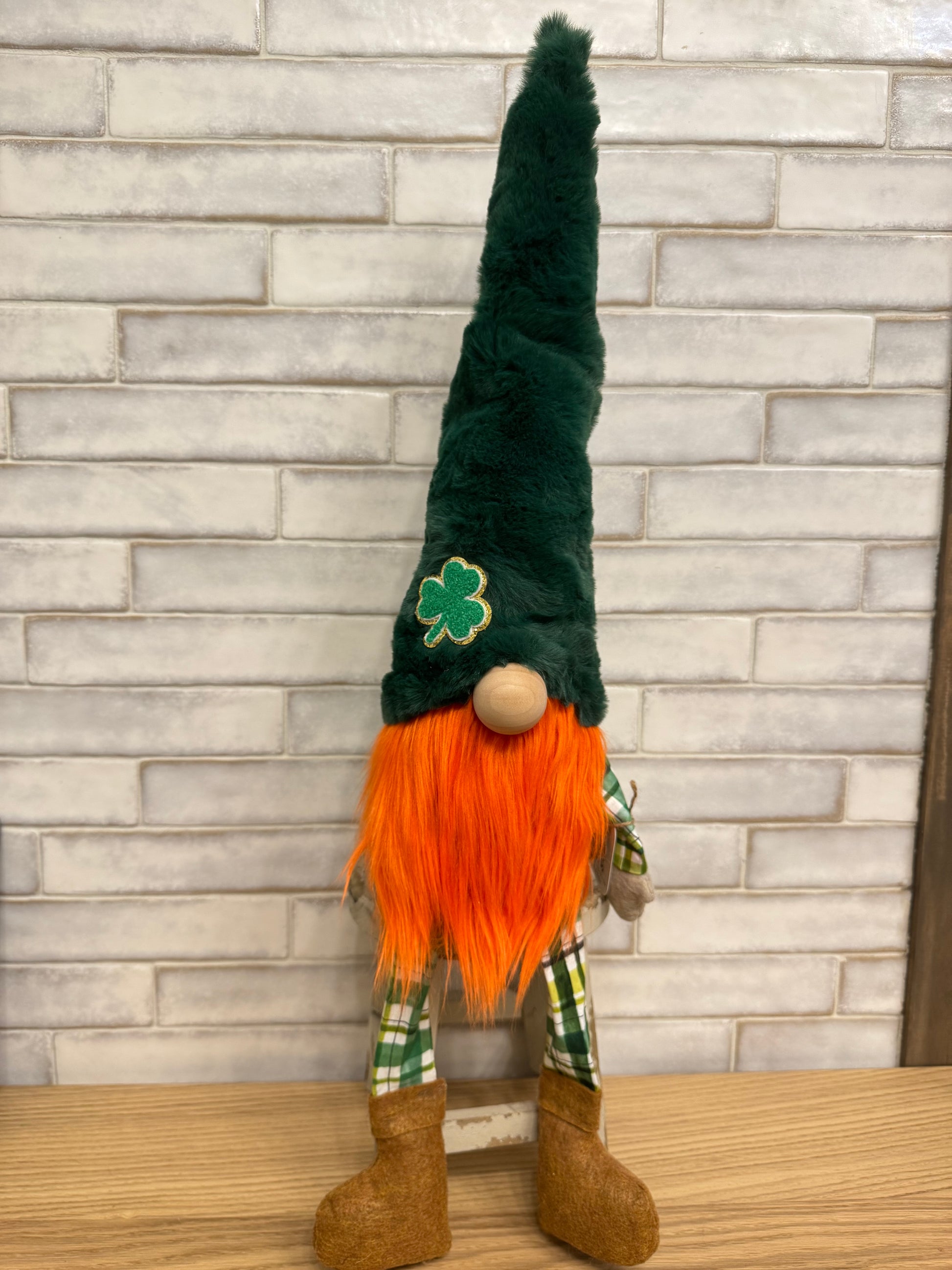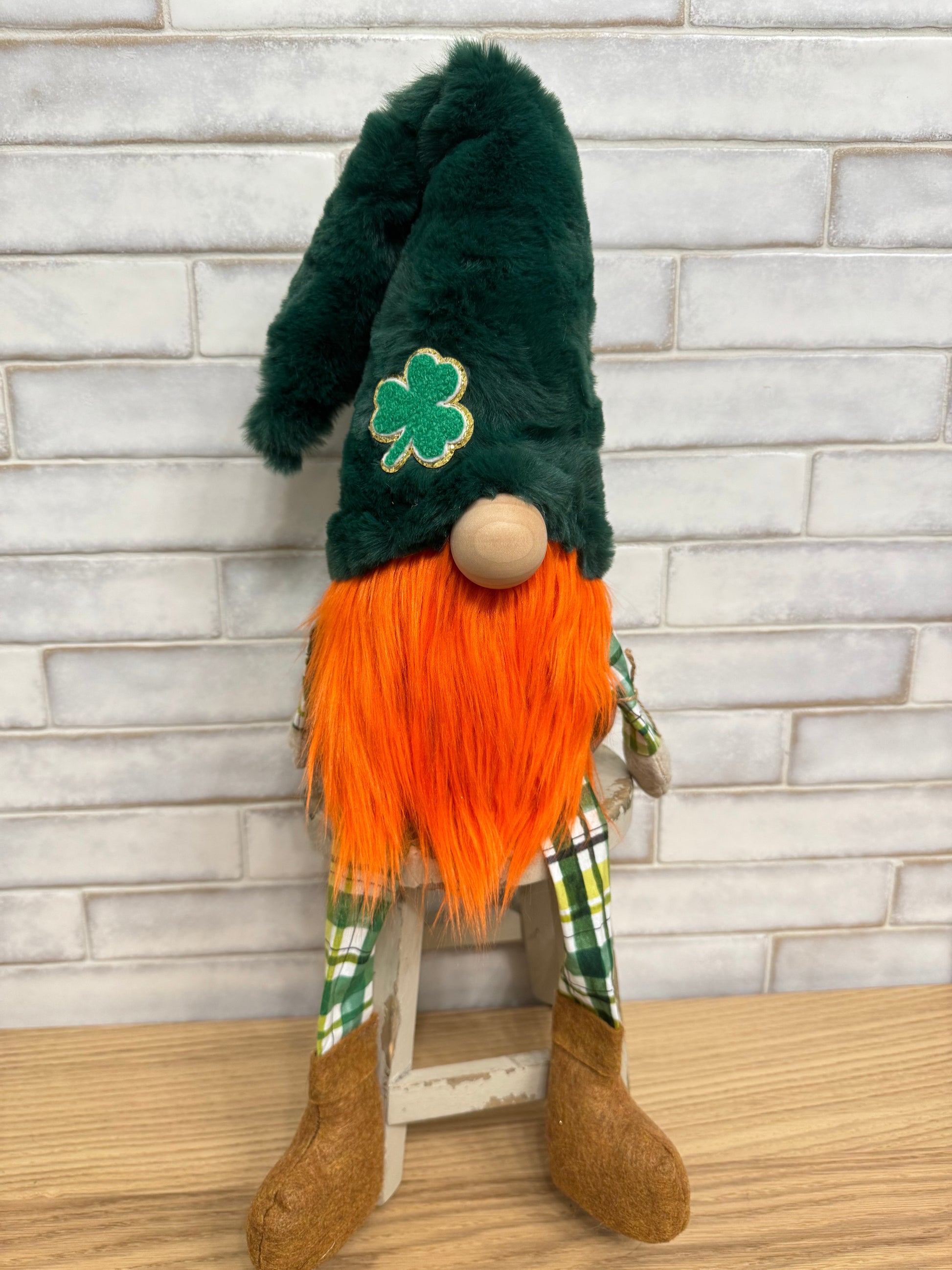 Donny Boy features a green minky hat with a shamrock on it, golden or rust shoes and plaid fabric.