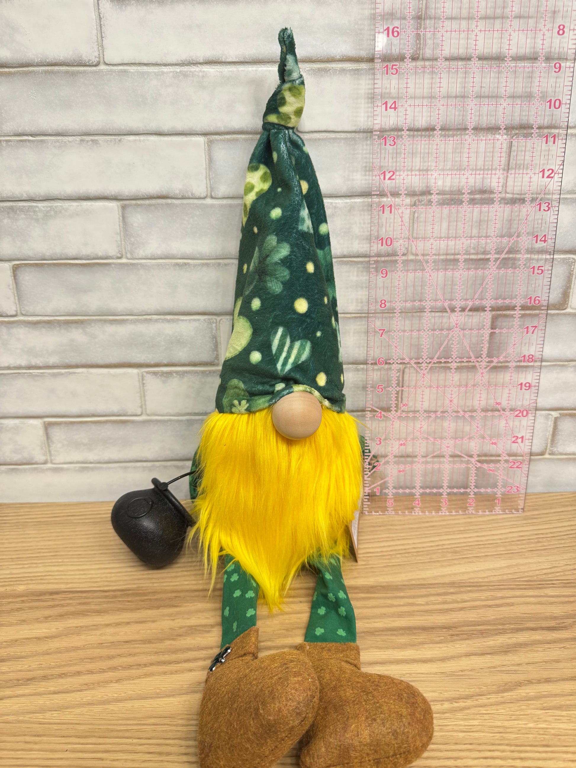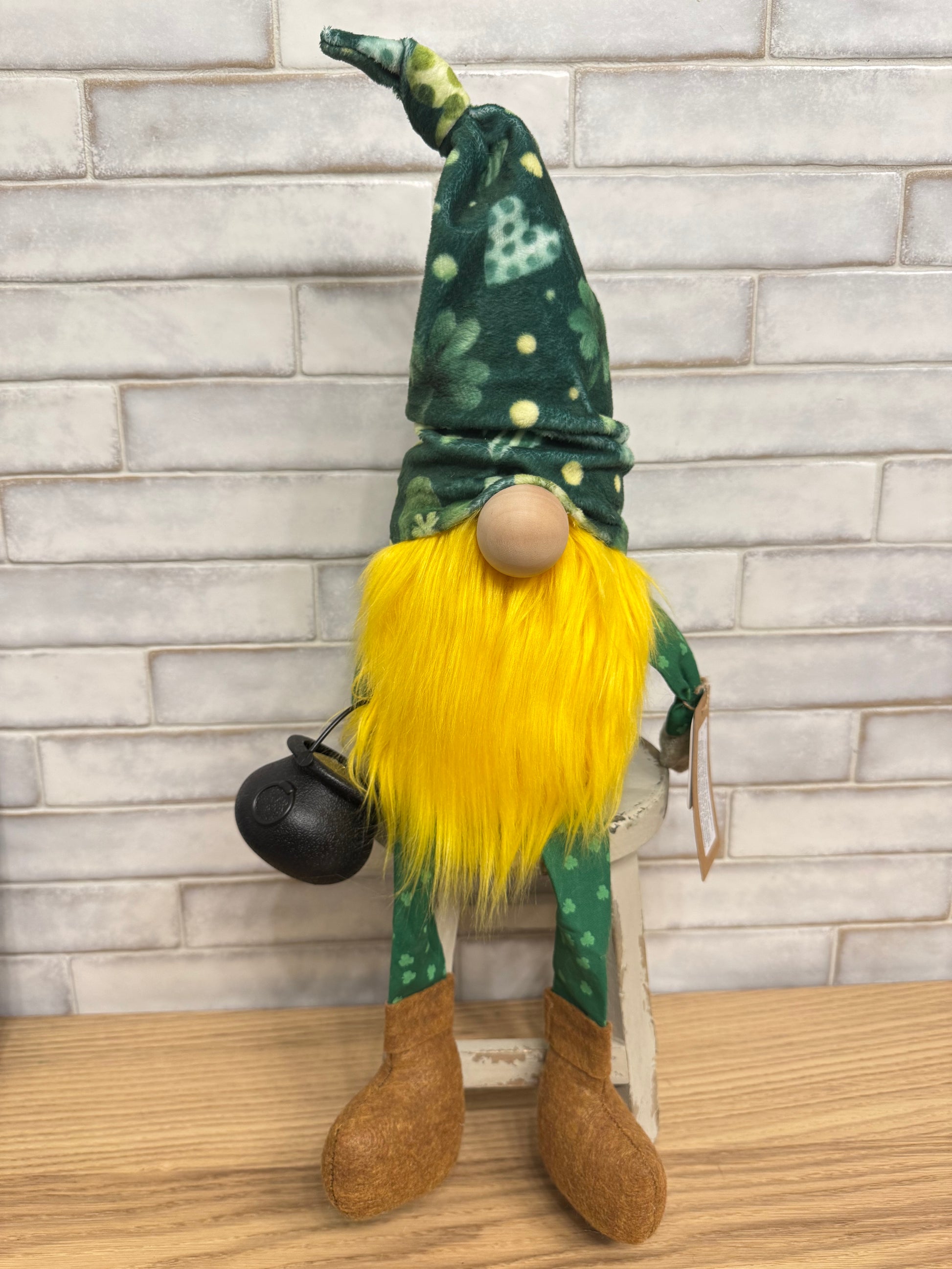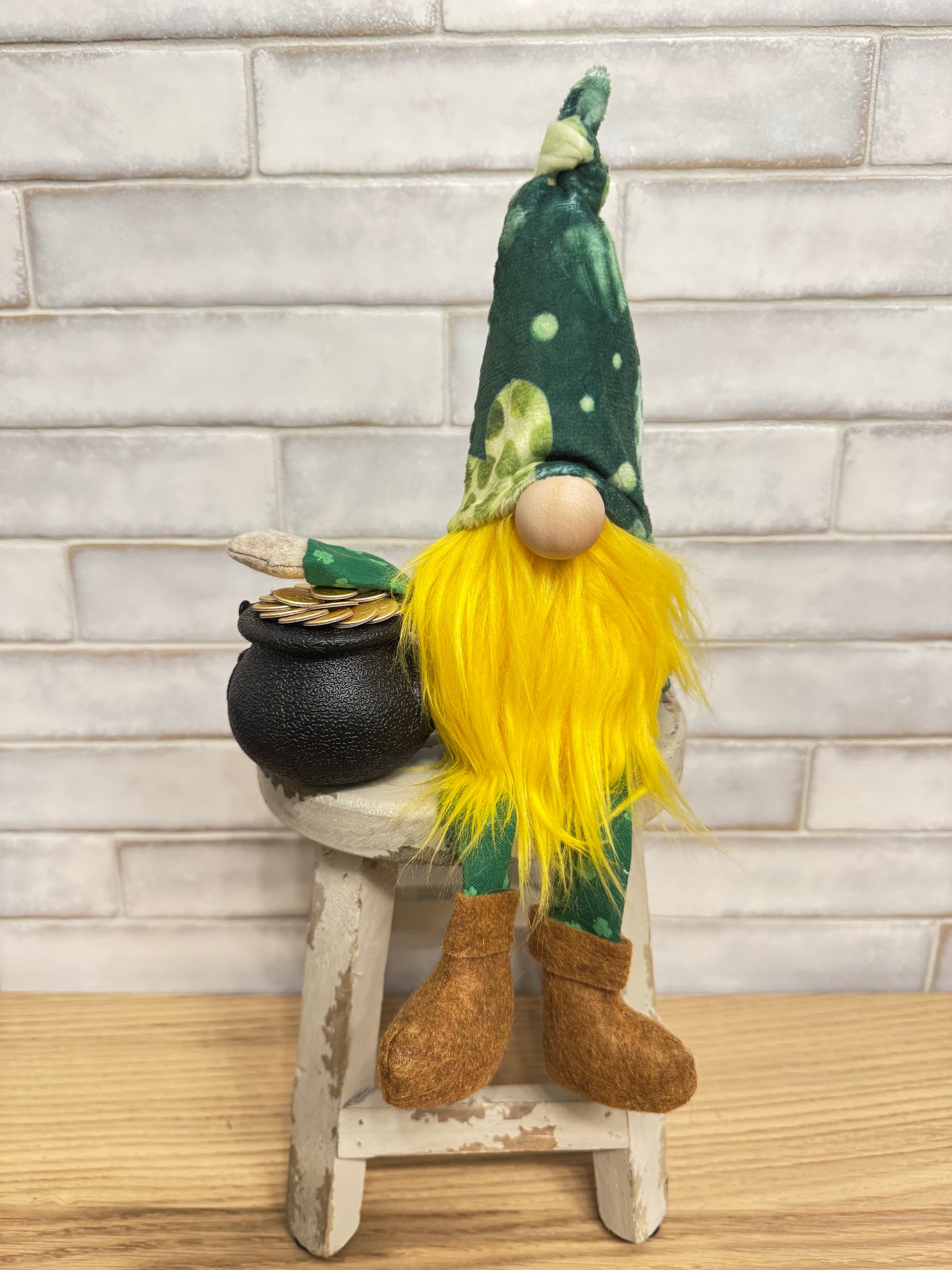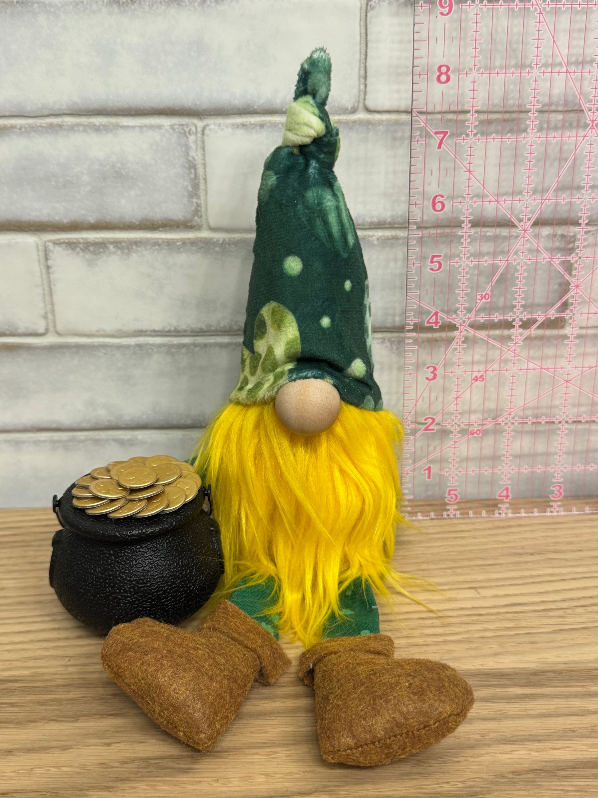 Golden Gregory features a soft shamrock minky hat, golden shoes, shamrock fabric, and a pot of gold.