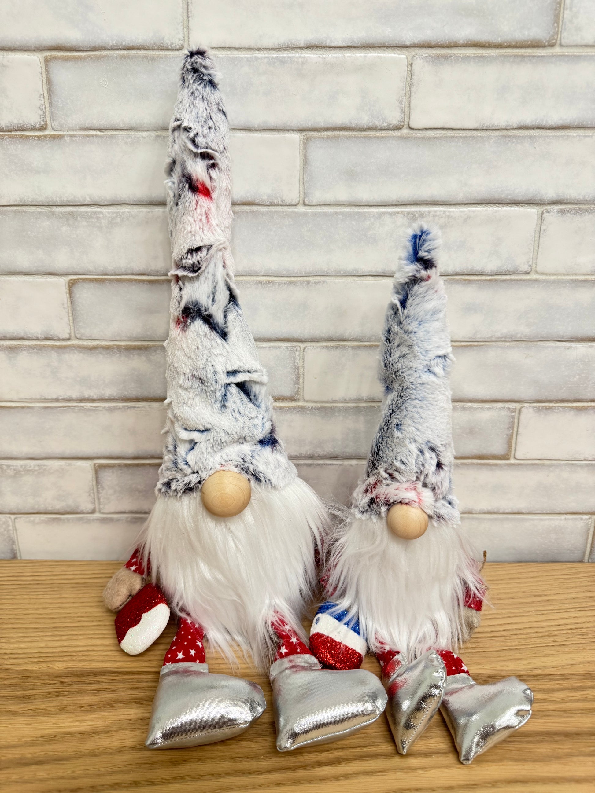 Elevate your patriotic decor with this festive gnome, featuring minky stars for a soft touch, making it a charming addition to your celebrations. Show off your love for the USA with this charming decoration.