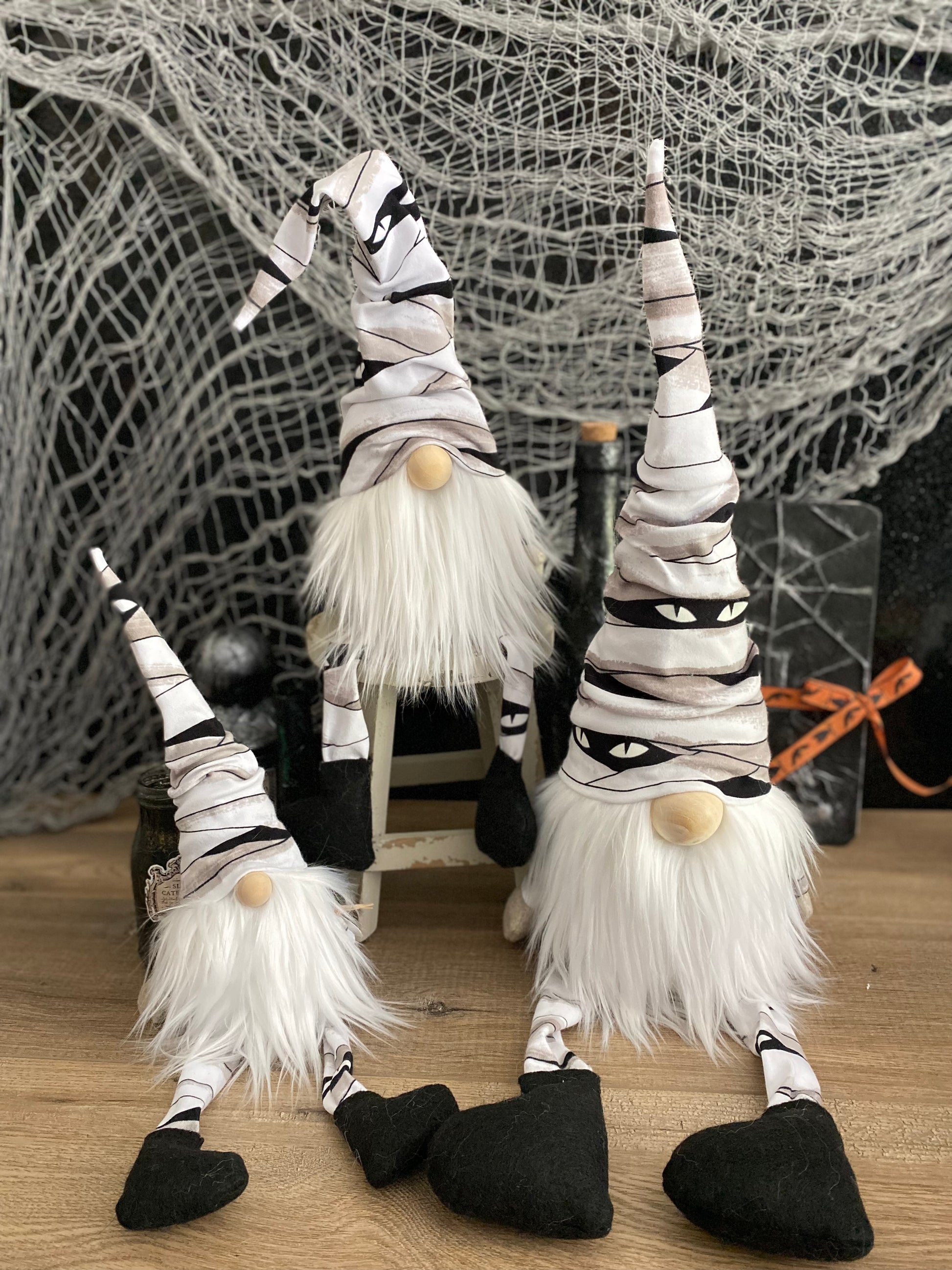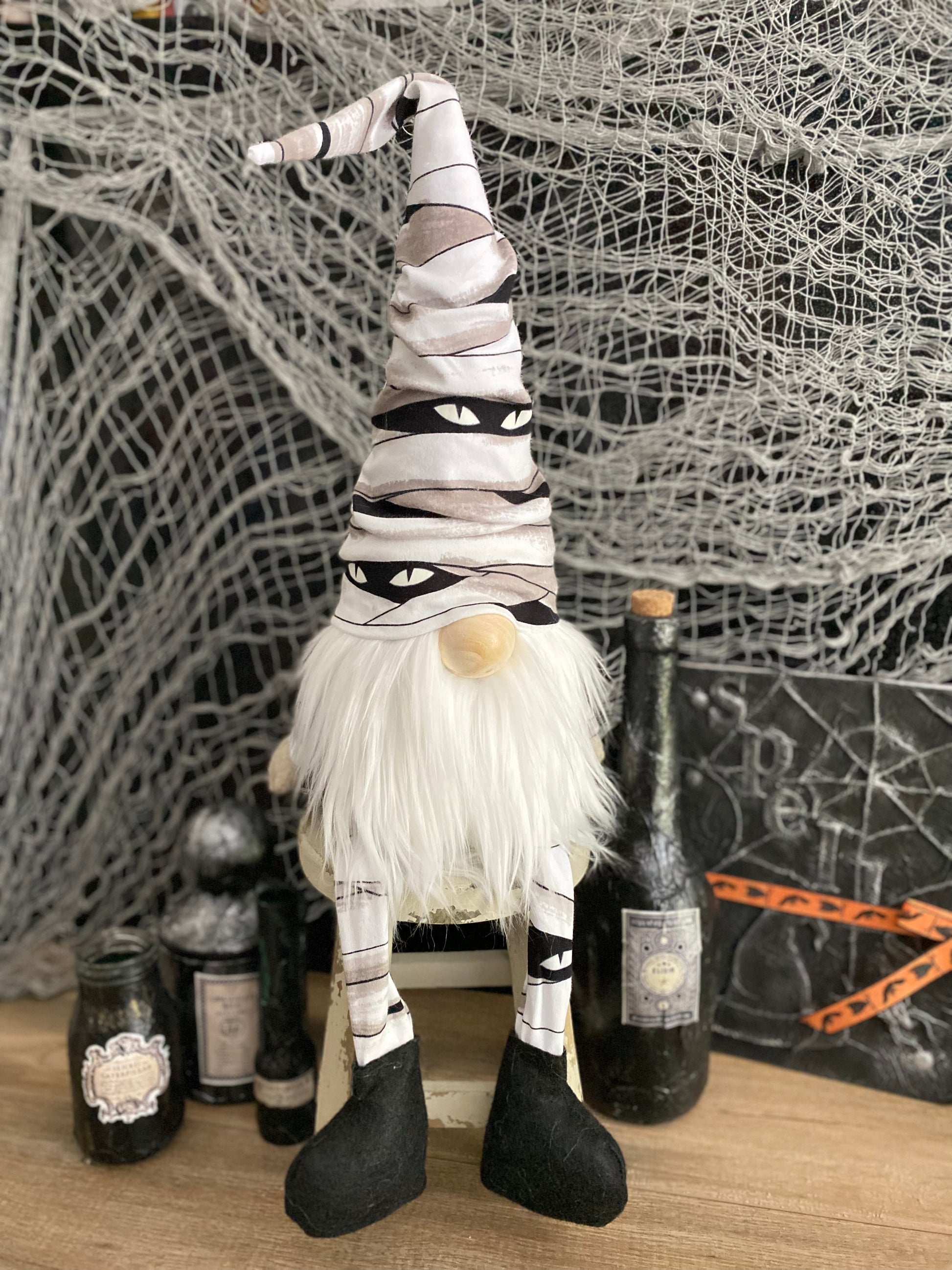 Mumford the Mummy has fun glow-in-the-dark eyes all over his body. Placement of patterns can vary from gnome to gnome.