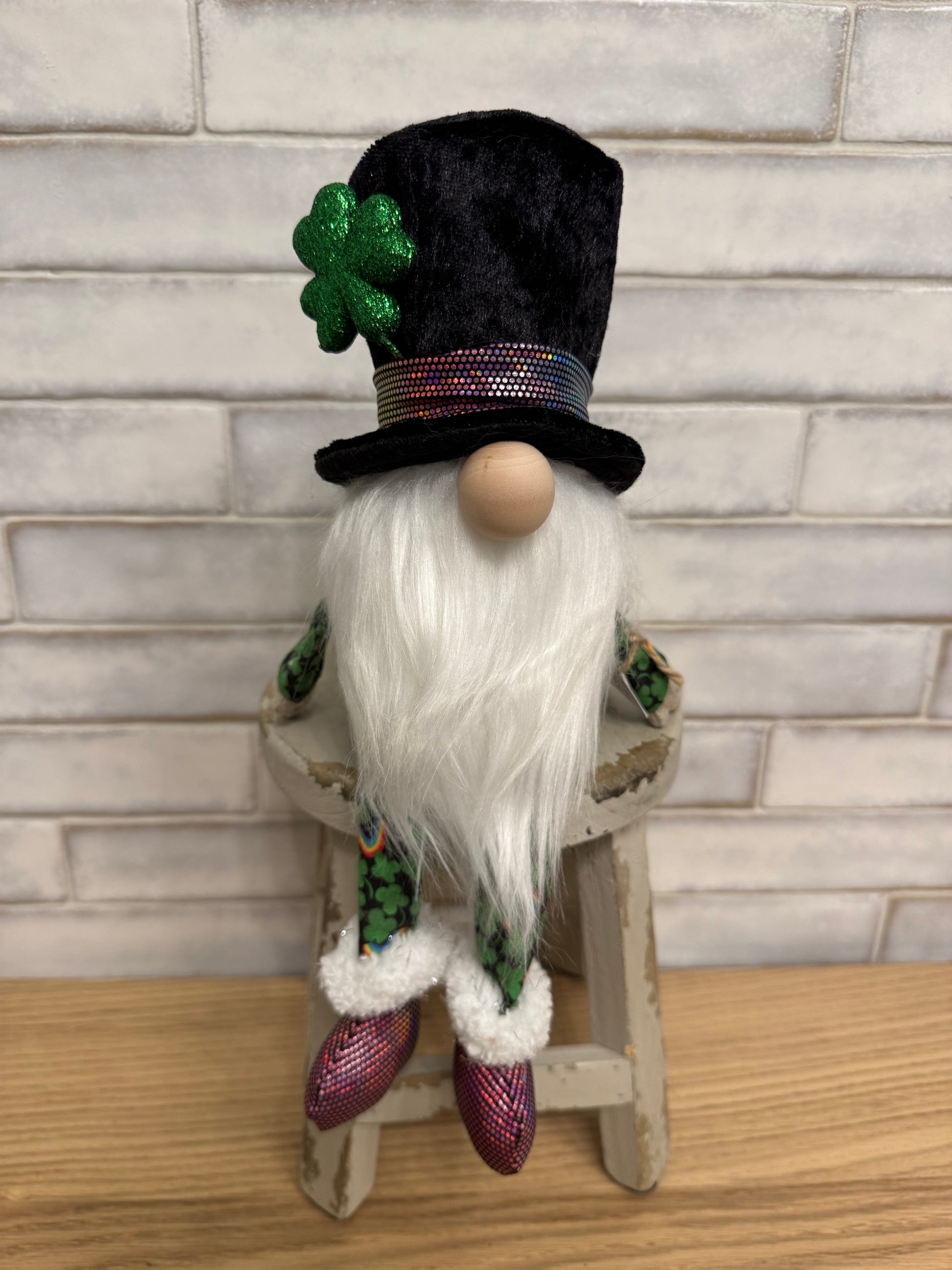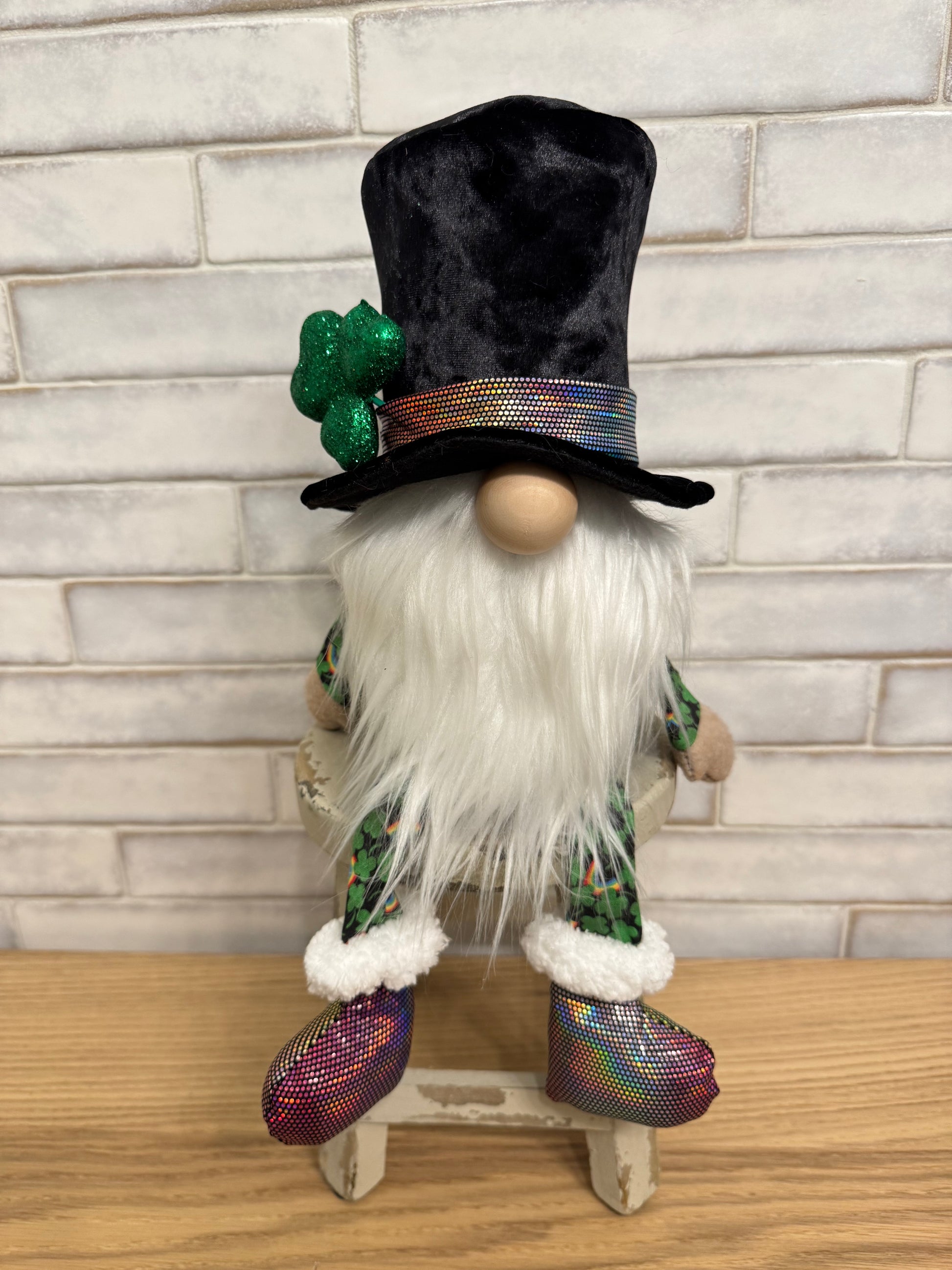 O'Riley is dressed to impress with iridescent-banded top hat, iridescent boots, and lucky suit complete with four-leaf clovers and rainbows.