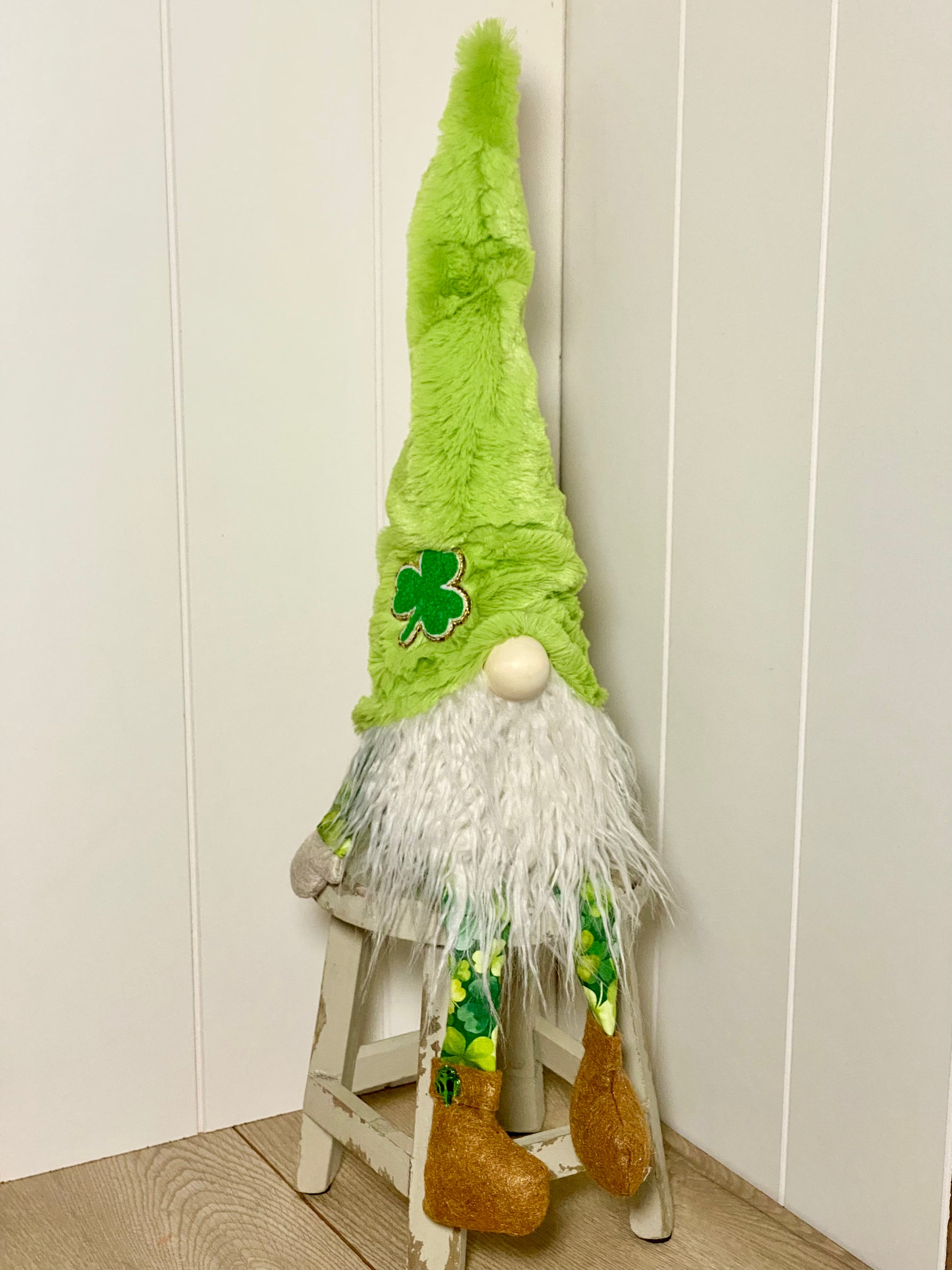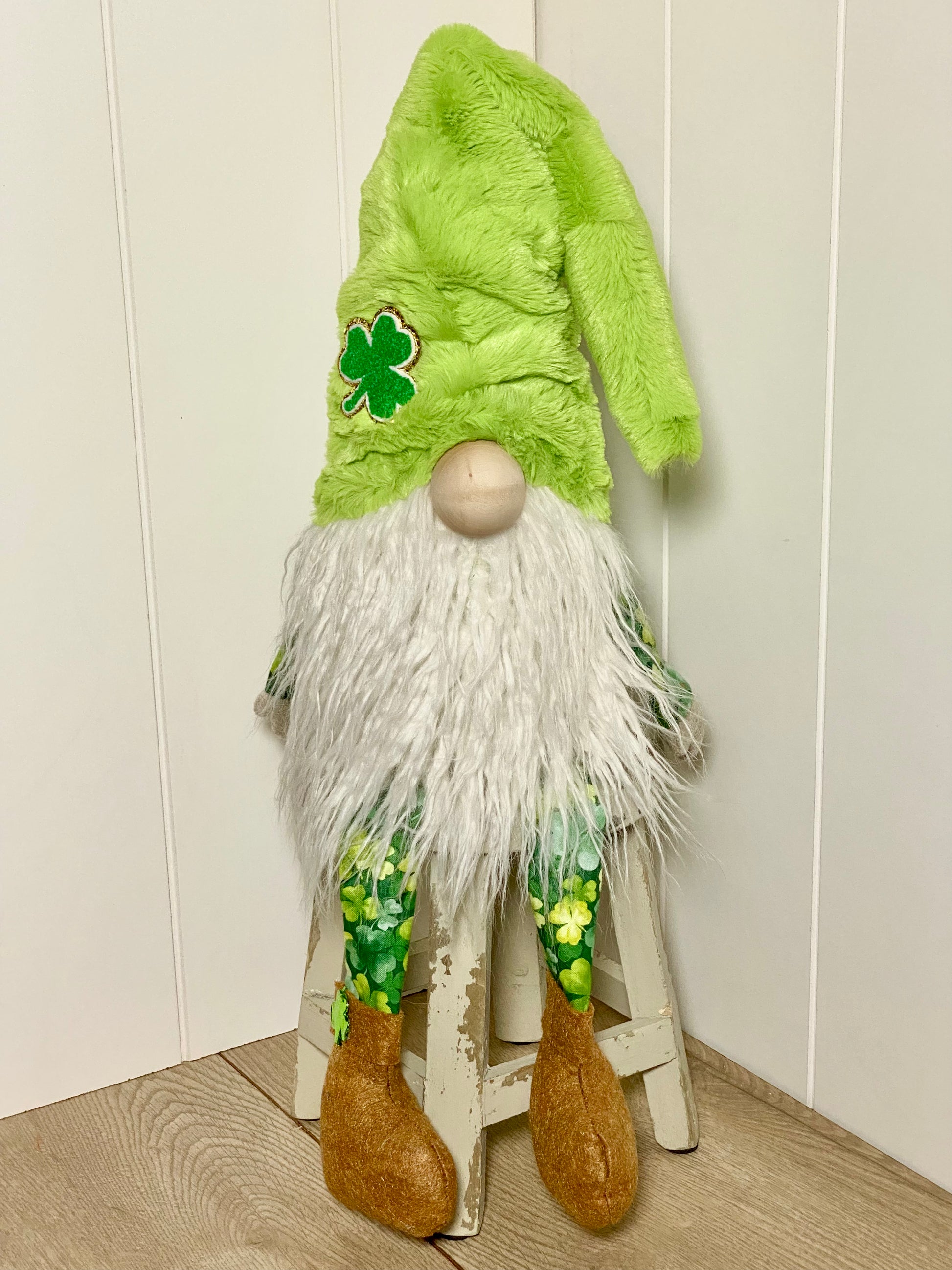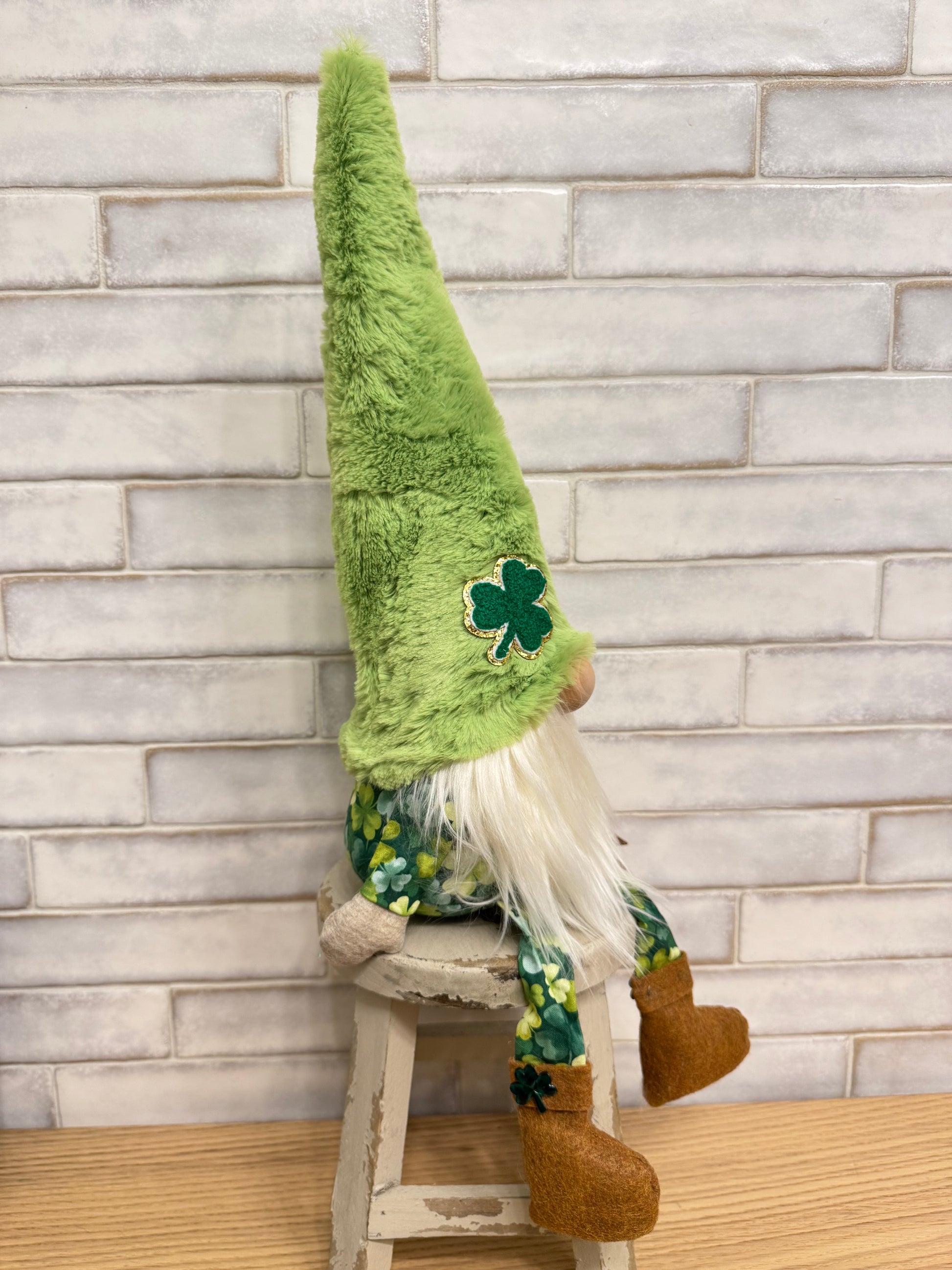 Sheldon Shamrock features a soft light green minky hat with a shamrock on it, rust colored shoes and shamrock fabric.