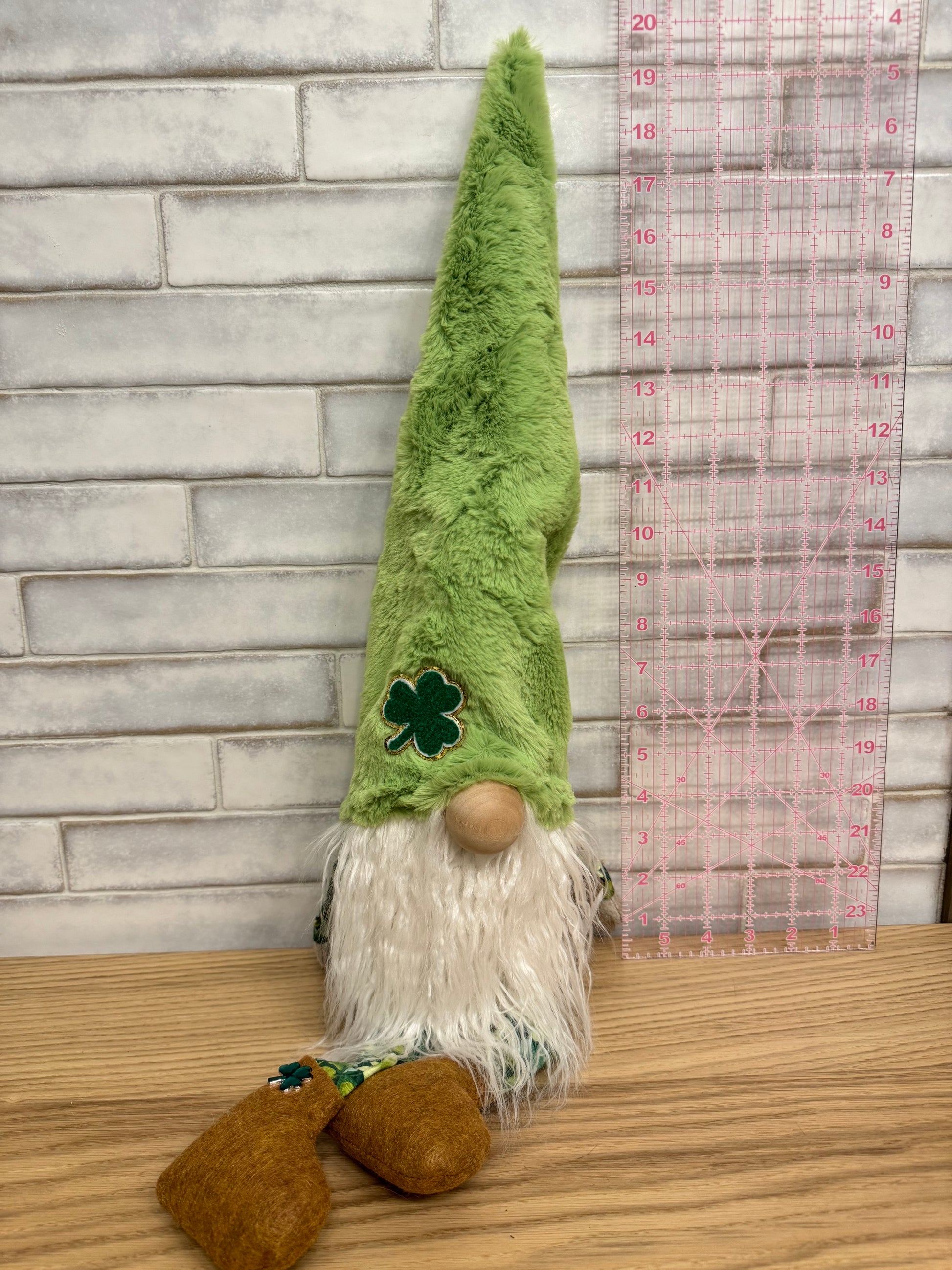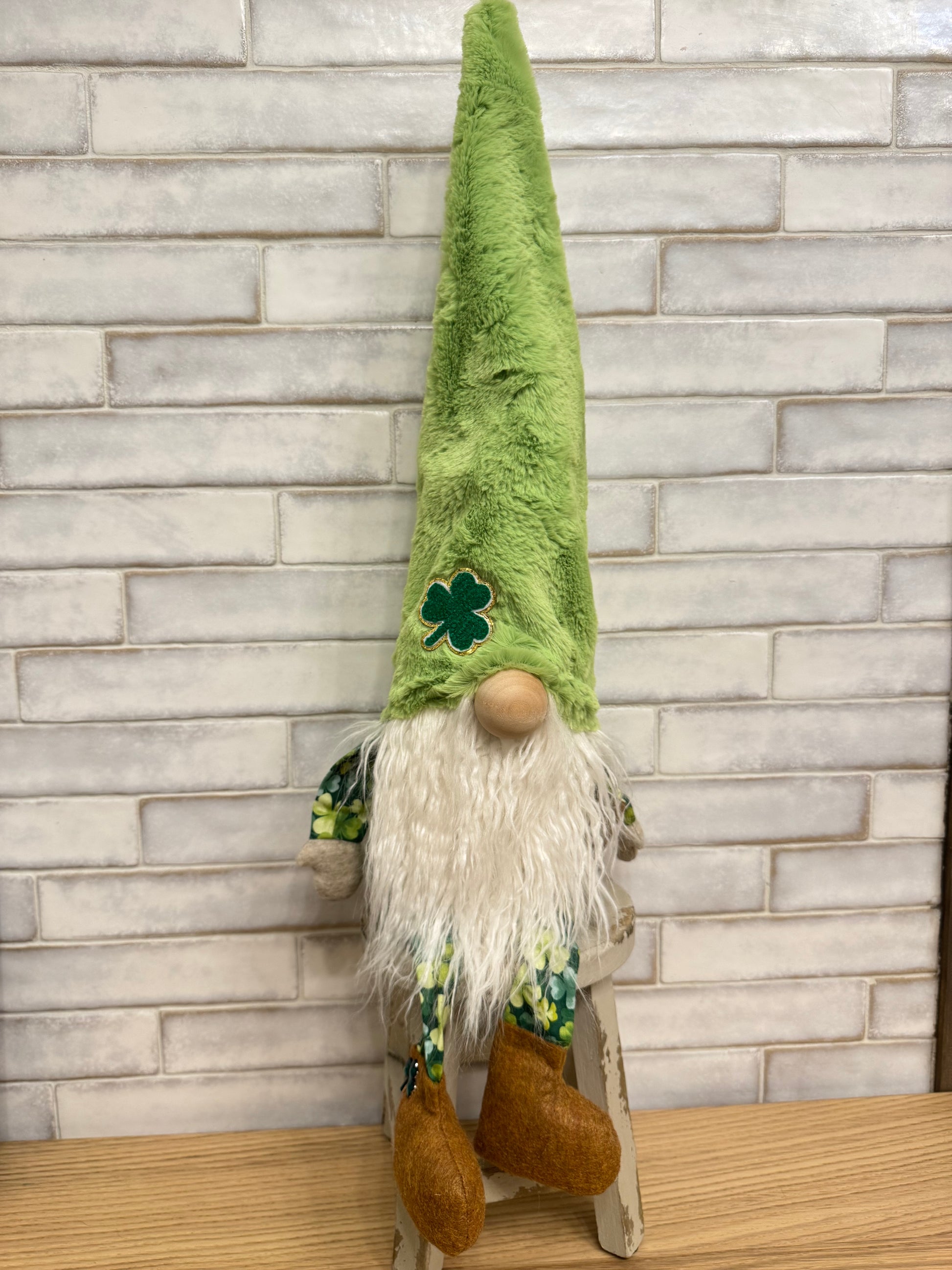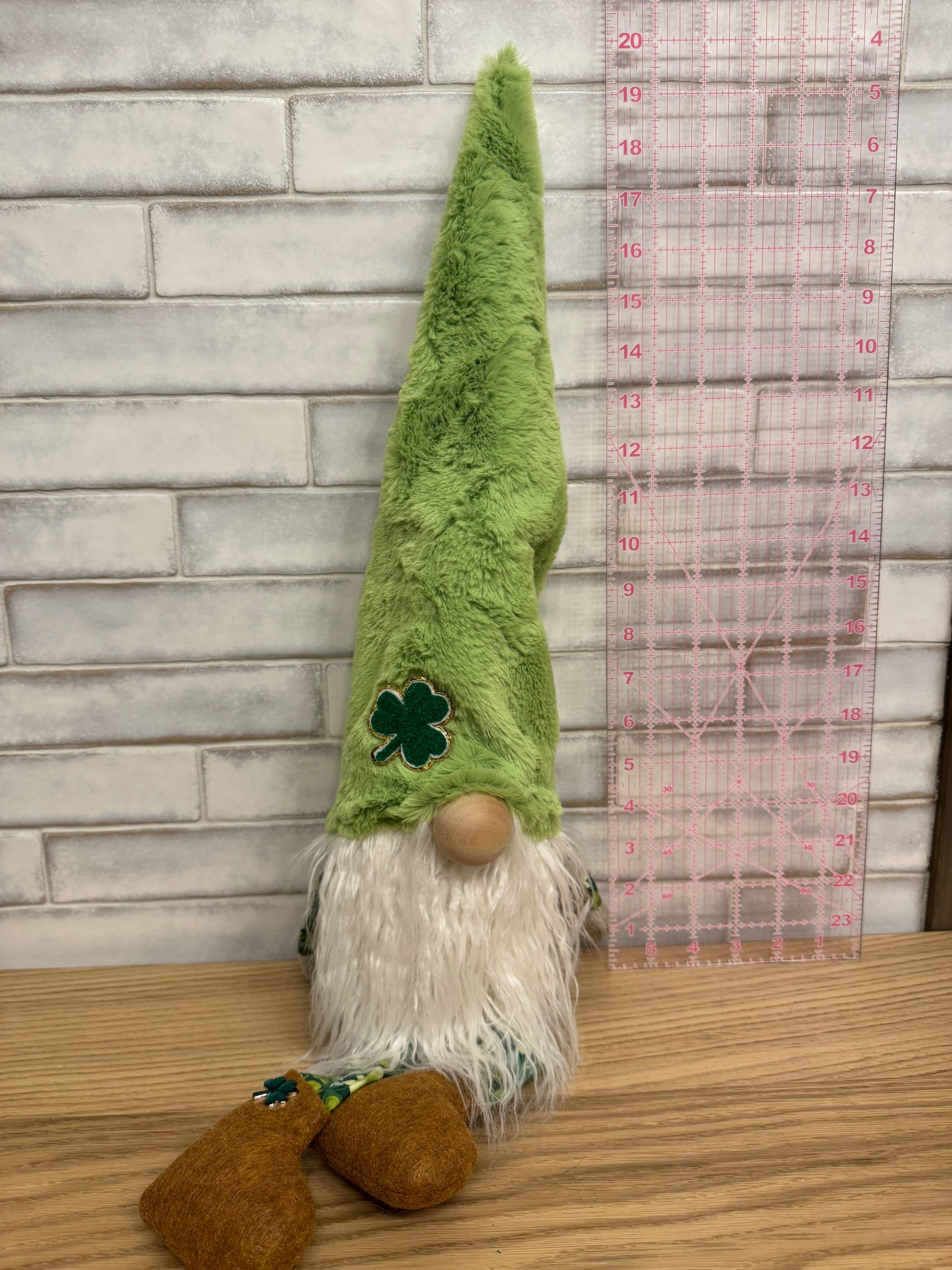 Sheldon Shamrock features a soft light green minky hat with a shamrock on it, rust colored shoes and shamrock fabric.